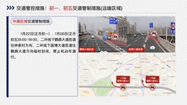 由于周边项目施工,往年从鹦鹉大道直达归元寺的翠微路、从汉阳大道直达归元寺的归元寺路前半段今年均封闭施工,车辆、行人无法通行。今年,归元寺周边设置“两入口三出口”,市民可从汉阳大道西桥路路口、鹦鹉大道归元寺南路入口步行前往归元寺,从归元寺南路、肖家湾路、归元寺路往国博大道方向的3个出口离开归元寺周边。