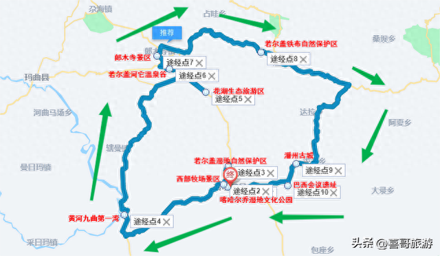 2、推荐若尔盖县景点自驾游行程路线:若尔盖县-喀哈尔乔湿地文化公园-西部牧场景区-若尔盖湿地自然保护区-黄河九曲第一湾-若尔盖花湖生态旅游区-若尔盖河它温泉谷-郎木寺景区-若尔盖铁布自然保护区-潘州古城-巴西会议遗址-若尔盖县