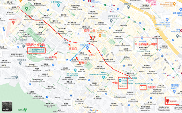 香港医学博物馆→永利街→楼梯街→元创方→文武庙→摩罗上街→大馆→兰桂坊→都爹利街→中环半山扶手电梯