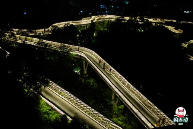 夜幕降临时,这里的颜值更是爆表,灯光璀璨的它宛如一条盘旋在山间的巨龙,太梦幻了。