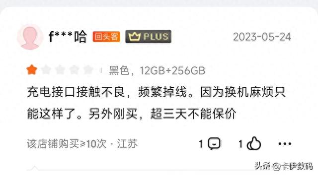 充电接口的接触不良问题在评价中也有不少,而且这位网友购买次数超过10次,可见是一个真实的米粉。卡伊本人之前买过一台红米Note11TPro+给我妈妈,也是经常遇到充电来回掉线的情况,非常让人恼火,后来去售后更换数据线,清理充电口,弄了半天才勉强修好。小米13旗舰的定位也出现这种问题,确实是不应该,品控质量有待提高。